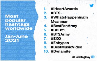 ¡§#EXO¡¨©M¡§#Enhypen¡¨¤À§O¦ì©~²Ä¤C©M²Ä¤K¡C¨¾¼u¯»µ·¸s¼Ðñ¡§#BTSArmy¡¨©M¨¾¼u¼ö¦±¡§#Dynamite¡¨¤À§O±Æ¦b²Ä¤»©M²Ä¤Q¡C±Æ¦W²Ä¤@ªº¬O¬ü°ê½u¤W¹{¼ú§¡§#iHeartAwards¡¨¡A±Æ²Ä¤Tªº¬O©M½q¨lx¨Æ¬FÅܬÛÃö¼Ðñ¡§#WhatsHappeninginMyanmar¡¨¡C