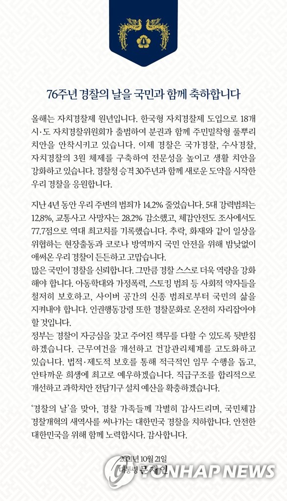 韓聯社首爾10月21日電 21日,南韓總統文在寅在社交網站上發文慶祝“警察日”設立76週年。他強調,要繼續帶著群眾的信任與支援,進一步加強警察隊伍建設。