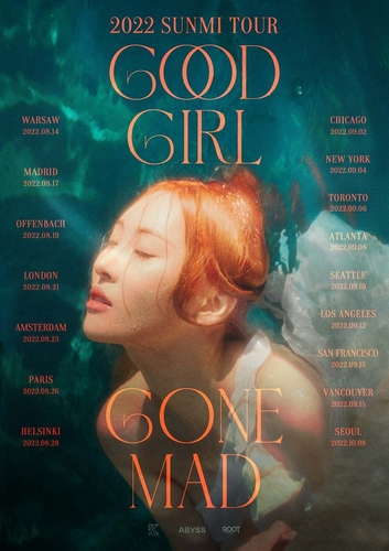 韓聯社首爾6月30日電 經紀公司ABYSS Company于30日表示,旗下歌手宣美將於8月啟動第二次世界巡演“GOOD GIRL GONE MAD”。