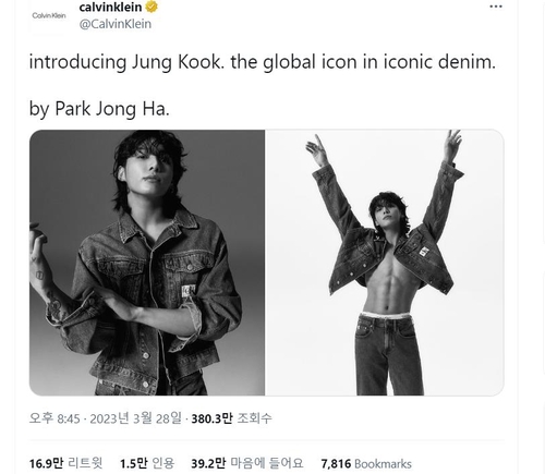 Calvin Klein于28日在推特官方賬戶發佈柾國身穿自家新品的照片。美國《好萊塢報道》用不少篇幅報道這一消息稱,防彈少年團又一位超級明星開始了時裝宣傳活動。