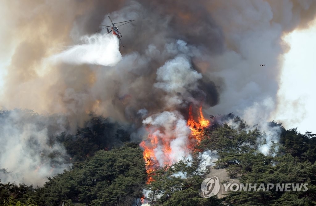 韓聯社首爾4月3日電 首爾市鐘路區仁王山失火20小時仍未被完全撲滅,消防部門連夜撲救後再次動用消防直升機,加快開展余火清理工作。