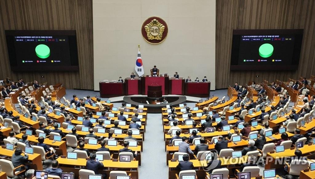 韓聯社首爾4月3日電 南韓國會3日召開全體會議,全場一致通過關於助力政府申辦2030年釜山市世界博覽會(世博會)的決議案。
