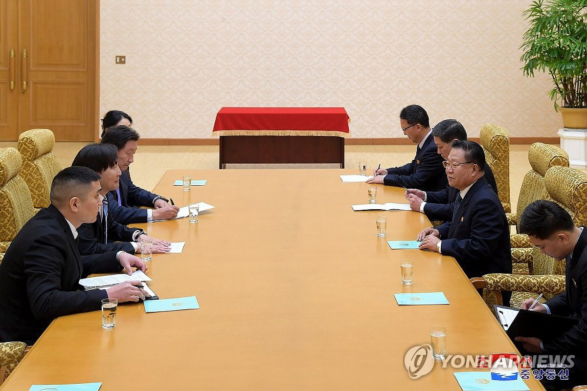 資料圖片:據朝中社1月30日報道,受朝鮮國務委員會委員長金正恩委任,最高人民會議常任委員會委員長崔龍海(右排右二)前一日在萬壽臺議事堂接受蒙古國新任駐朝鮮大使額爾登達瓦(左排左二)遞交的國書。圖為雙方舉行會談。 韓聯社/朝中社(圖片僅限南韓國內使用,嚴禁轉載複製)