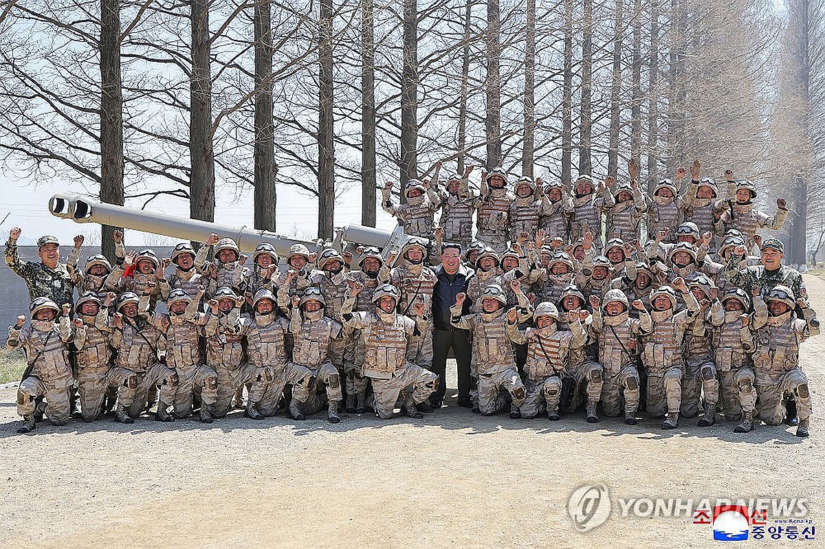 朝中社4月16日報道稱,金正恩在金日成生日到來之際,于前一天觀摩了人民軍西部地區大聯合部隊旗下的炮兵分隊進行的炮擊比賽。圖為金正恩(黑衣)與官兵合影。 韓聯社/朝中社官網截圖(圖片僅限南韓國內使用,嚴禁轉載複製)