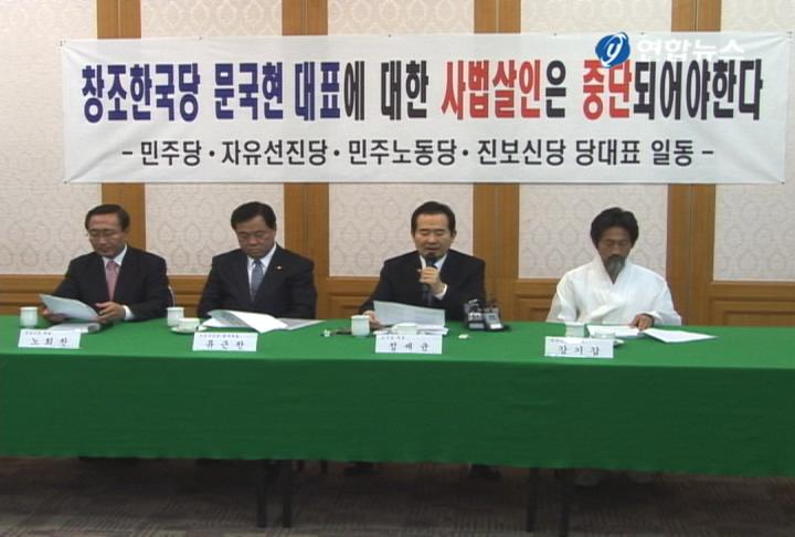 (서울=연합뉴스) 강병철 기자 = 민주당 정세균 대표와 자유선진당 류근찬 원내대표, 민주노동당 강기갑, 진보신당 노회찬 대표는 17일 "창조한국당 문국현 대표에 대한 사법살인은 중단돼야 한다"고 밝혔다.