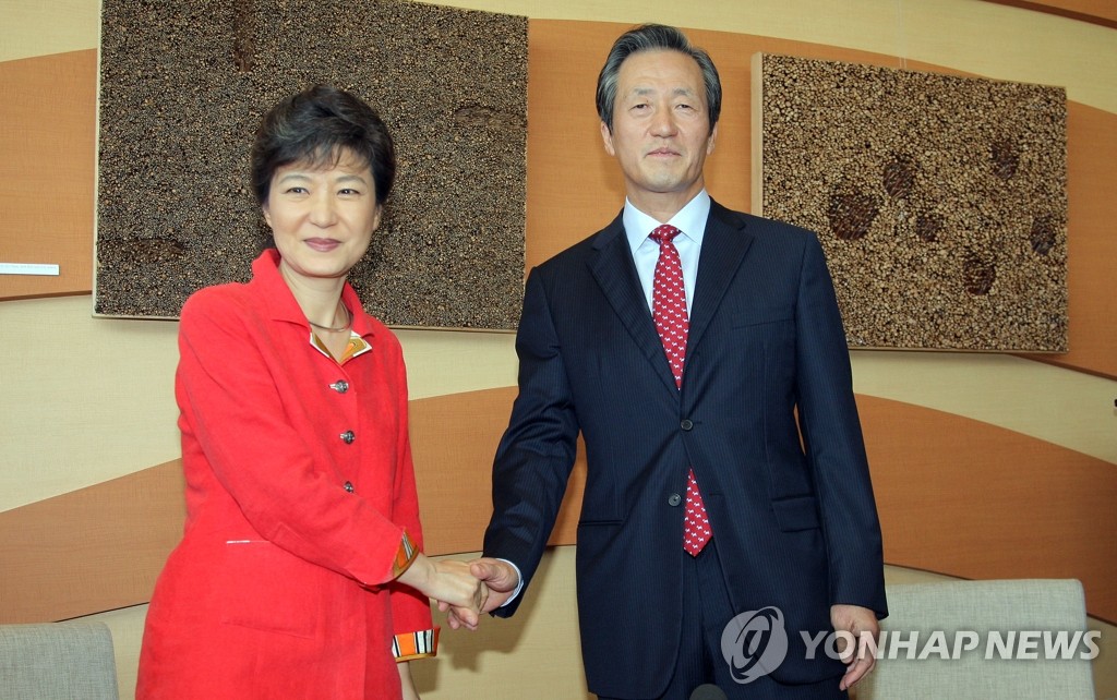 (서울=연합뉴스) 이정훈 기자 = 한나라당 정몽준 대표와 박근혜 전 대표가 18일 오후 국회 의정관 가배두림에서 만나 악수하고 있다. 2009.9.18
