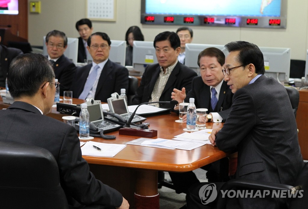 (서울=연합뉴스) 이명박 대통령이 27일 오전 서해상에서 전날 발생한 해군 초계함 천안함 침몰사건의 대책을 논의하기 위한 안보관계장관회의를 재소집해 대책을 논의하고 있다.