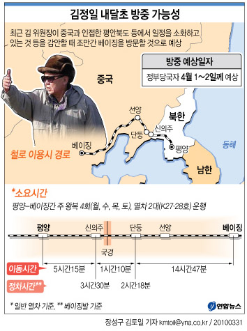 베이징 외교가에선 김 위원장이 방중한다면 후진타오(胡錦濤) 국가주석과 원자바오(溫家寶)총리, 시진핑(習近平) 국가부주석의 일정이 없고 4월 9일에 북한에서 최고인민회의가 개막된다는 점에서 다음달 초순이 적기로 보고 있다.