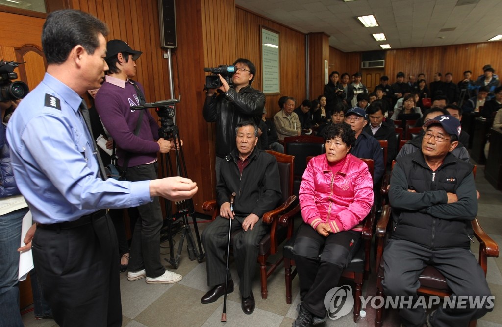(인천=연합뉴스) 하사헌 기자 = 지난 2일밤 캄보디아 국적 화물선과 충돌, 침몰한 것으로 추정되는 쌍끌이어선 금양98호 사망자 및 실종자 가족들이 4일 오전 인천해양경찰서에서 열린 브리핑에서 해경의 출동구조과정에 대한 이춘재 인천해경서장의 해명을 듣고 있다. 2010.4.4