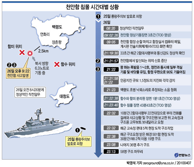 (서울=연합뉴스) 박영석 기자 = 천안함 침몰사고를 조사중인 민.군 합동조사단은 7일 천안함 사고발생 시각이 지난달 26일 오후 9시22분이라고 재확인했다.