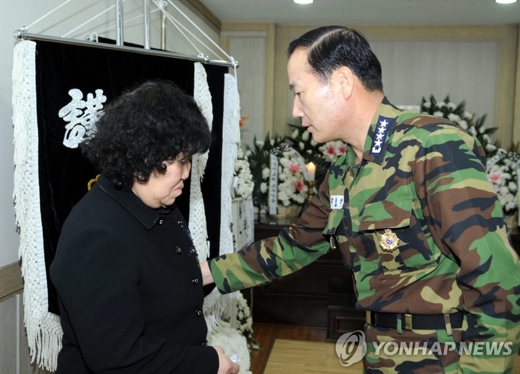 (인천=연합뉴스) 김성찬 해군참모총장은 10일 인천시 남구 학익동의 송도가족사랑병원 장례식장에 마련된 금양98호 사망선원 빈소를 찾아 조문했다. 쌍끌이 저인망어선 금양98호는 지난 2일 천안함 실종자 수색에 참여했다가 조업해역으로 복귀 중 연락 두절됐으며, 타고 있던 선원 9명 가운데 2명은 사망, 7명은 실종됐다. 2010.04.10. <<해군 인천해역방어사령부>>
