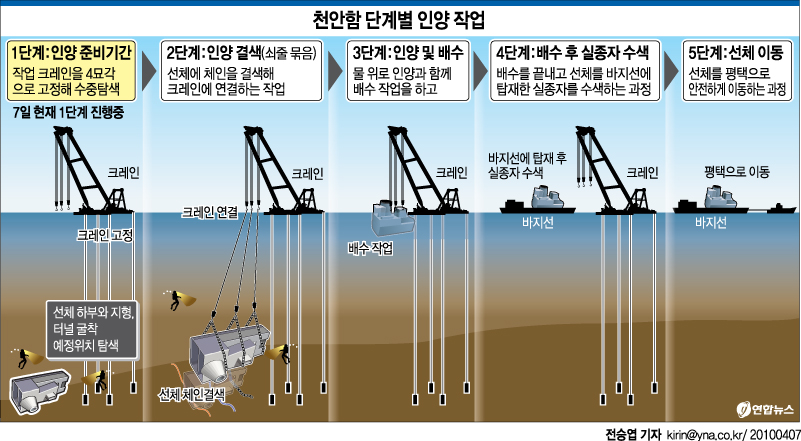 이 때문에 군은 선체가 바지선으로 인양되고 나면 우리 전문 요원 뿐 아니라 외국 전문가들의 절단면 접근을 허용할 계획인 것으로 알려졌다.
