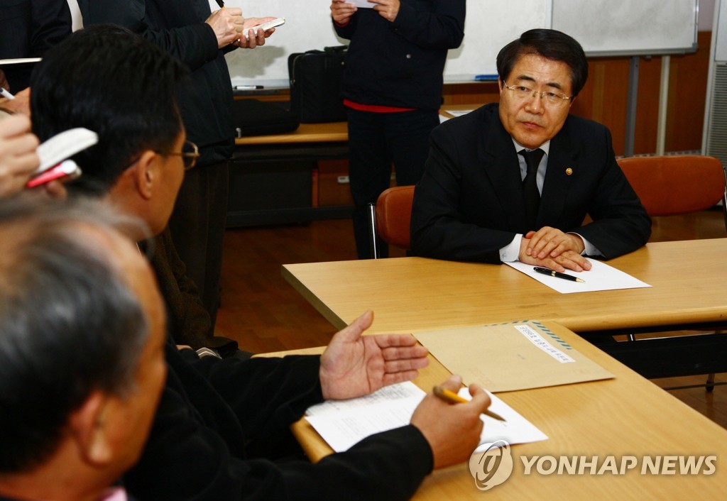 (서울=연합뉴스) 장태평 농림수산식품부 장관이 11일 오후 인천시 연안동주민센터를 방문해 실종 선원가족의 애로사항을 듣고 있다.