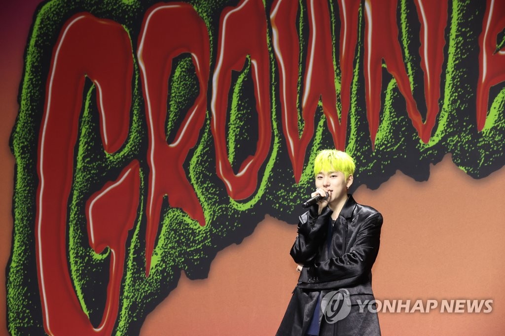 (서울=연합뉴스) 강민지 기자 = 가수 지코가 1일 오후 서울 강남구 그랜드인터컨티넨탈서울파르나스에서 열린 미니 4집 '그로운 애스 키드(Grown Ass Kid)' 발매 기념 기자간담회에서 타이틀곡 '괴짜'를 소개하고 있다. 2022.8.1 mjkang@yna.co.kr