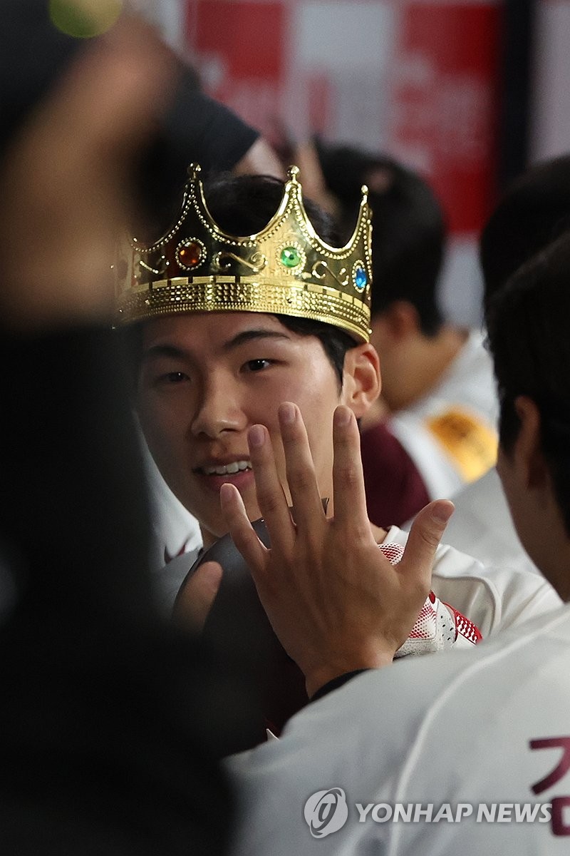 키움 김혜성이 1회말 2사에 솔로포를 날린 뒤 더그아웃에서 왕관을 쓰고서 축하를 받고 있다. 2024.4.7 utzza@yna.co.kr