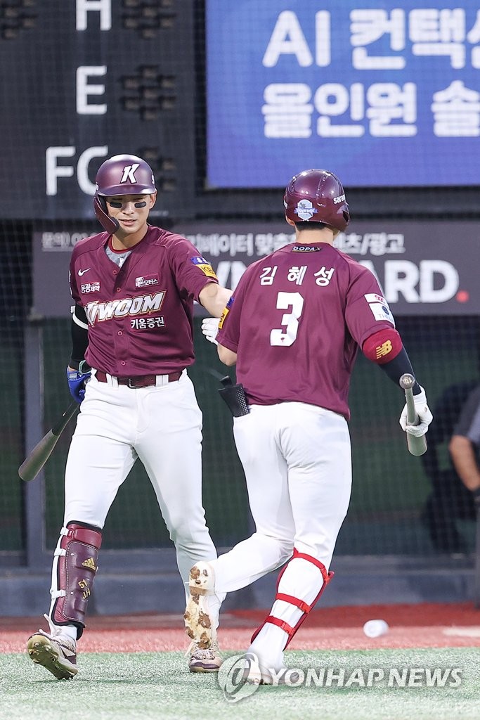 (수원=연합뉴스) 신현우 기자 = 17일 경기도 수원케이티위즈파크에서 열린 2022 프로야구 KBO리그 키움 히어로즈와 kt wiz의 경기. 3회초 2사 키움 김혜성이 솔로 홈런을 쳐낸 뒤 이정후에게 축하받고 있다. 2022.8.17 nowwego@yna.co.kr