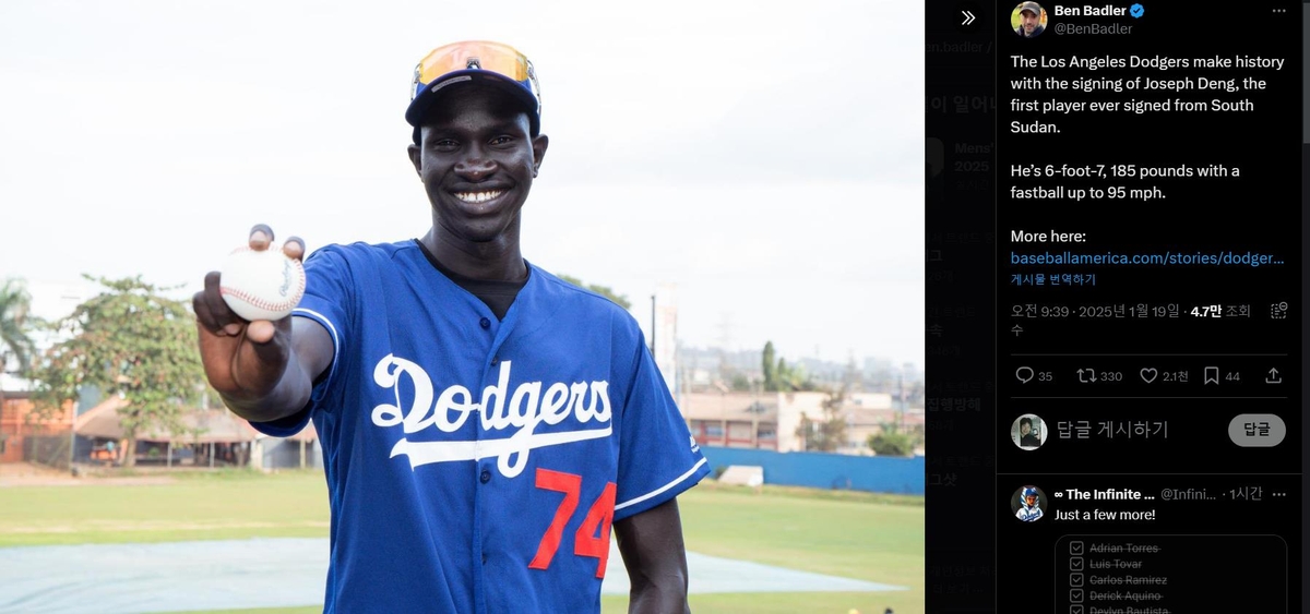 이 매체는 "다저스가 남수단 출신의 만 17세 오른손 투수 조지프 덩과 국제 계약을 체결했다"며 "덩은 신장 200.7㎝, 몸무게 83.9㎏의 마른 체격이지만, 최고 시속 153㎞의 빠른 직구를 던지는 선수"라고 소개했다.