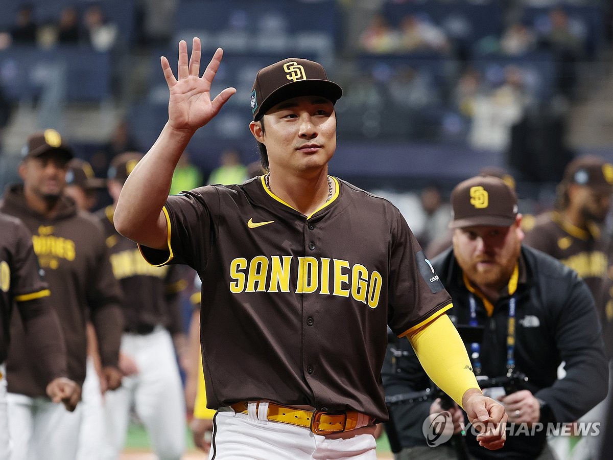 (서울=연합뉴스) 이지은 기자 = 17일 오후 서울 고척스카이돔에서 미국프로야구(MLB) 공식 개막시리즈를 앞두고 열린 팀코리아 대 샌디에이고 파드리스 연습 경기. 김하성이 입장하며 팬들을 향해 인사하고 있다. 2024.3.17 jieunlee@yna.co.kr