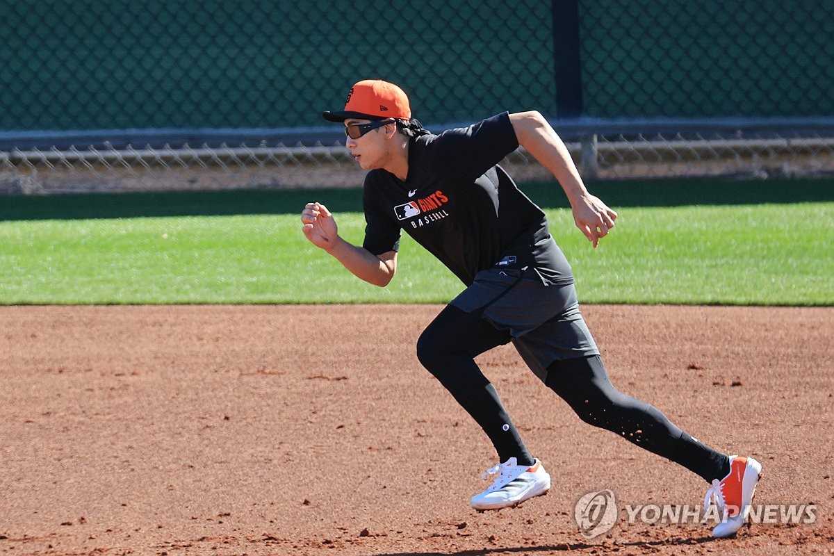 (스코츠데일[미국 애리조나주]=연합뉴스) 신현우 기자 = 미국프로야구 메이저리그(MLB) 두 번째 시즌을 준비하는 샌프란시스코 자이언츠 외야수 이정후가 15일(현지시간) 스프링캠프가 열린 미국 애리조나주 스코츠데일 스타디움에서 훈련하고 있다. 2025.2.16 nowwego@yna.co.kr