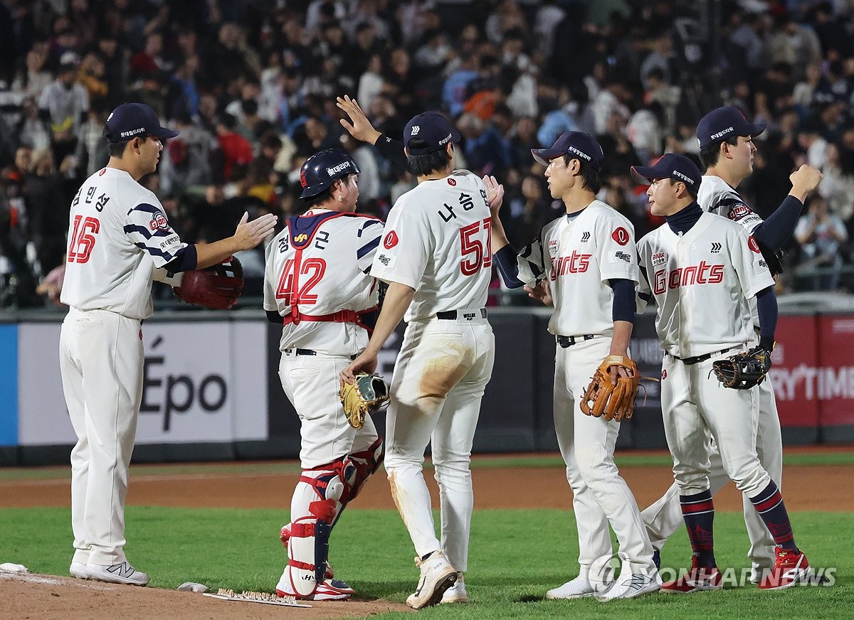 (부산=연합뉴스) 강선배 기자 = 24일 부산 사직야구장에서 열린 프로야구 2025 신한 SOL 뱅크 KBO리그 한화 이글스와 롯데 자이언츠의 경기. 롯데 선수들이 한화에 5-3으로 승리하고 기쁨을 나누고 있다. 2025.4.24 sbkang@yna.co.kr