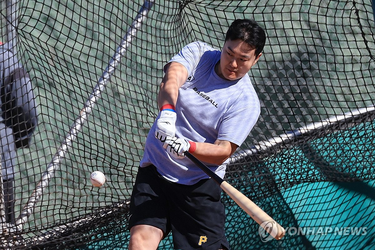 (스코츠데일[미국 애리조나주]=연합뉴스) 신현우 기자 = 지난해 미국프로야구 메이저리그(MLB) 뉴욕 메츠에서 방출된 최지만이 18일(현지시간) LG 트윈스 스프링캠프가 열리고 있는 미국 애리조나주 스코츠데일 인디언 스쿨 공원 야구장에서 LG 선수단과 타격 훈련하고 있다. 2025.2.19 nowwego@yna.co.kr
