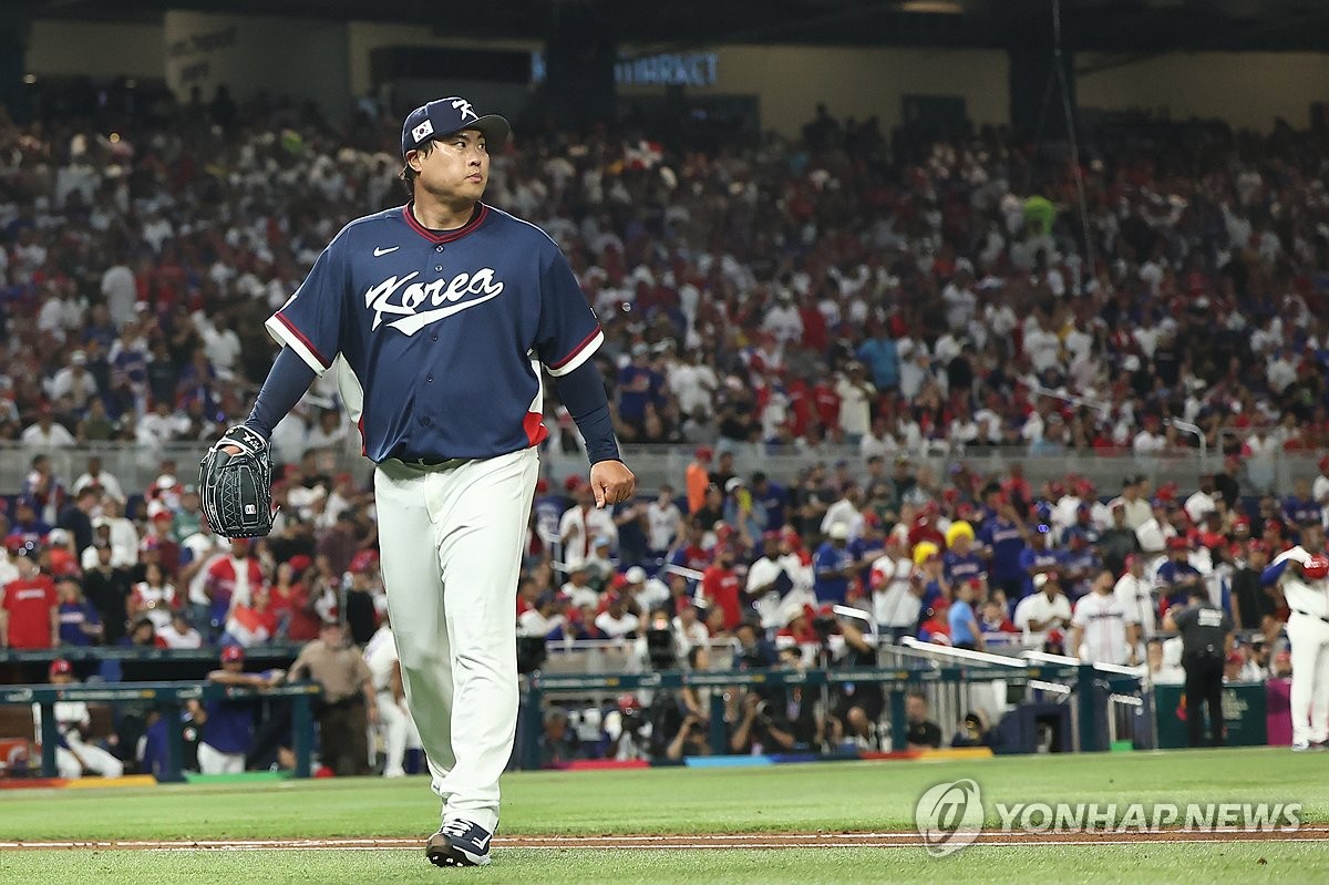 (마이애미=연합뉴스) 윤동진 기자 = 13일(현지시간) 미국 플로리다주 마이애미 론디포파크에서 열린 월드베이스볼클래식(WBC) 대한민국 대 도미니카공화국 준준결승전. 한국 선발투수 류현진이 2회 말 3실점 후 마운드에서 내려오고 있다. 2026.3.14 mon@yna.co.kr