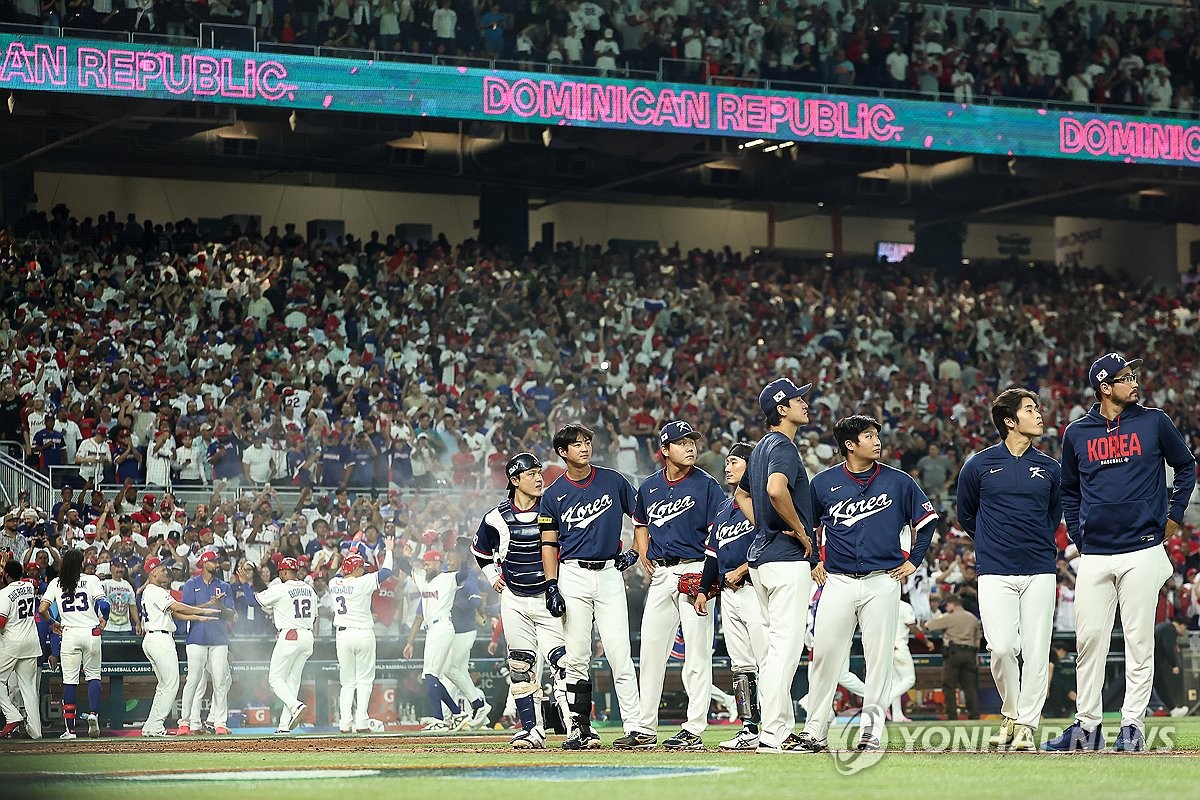 (마이애미=연합뉴스) 윤동진 기자 = 13일(현지시간) 미국 플로리다주 마이애미 론디포파크에서 열린 월드베이스볼클래식(WBC) 대한민국 대 도미니카공화국 준준결승전. 7회말 심판의 콜드게임 선언으로 0-10에 게임을 종료, 패배한 한국 선수들이 아쉬워하고 있다. 2026.3.14 mon@yna.co.kr