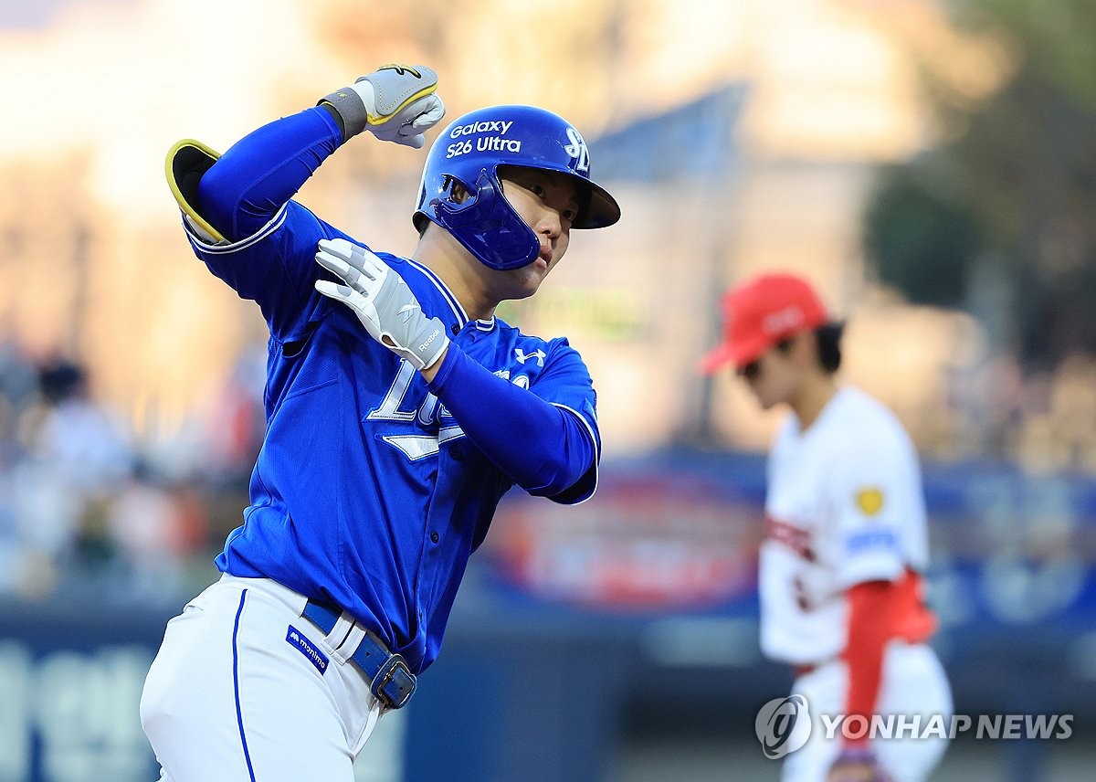 (광주=연합뉴스) 조남수 기자 = 7일 광주기아챔피언스필드에서 열린 프로야구 삼성 라이온즈와 KIA 타이거즈의 경기. 삼성 류지혁이 1회초 1사에서 우월 솔로 홈런을 치고 3루를 돌며 세리머니하고 있다. 2026.4.7 iso64@yna.co.kr