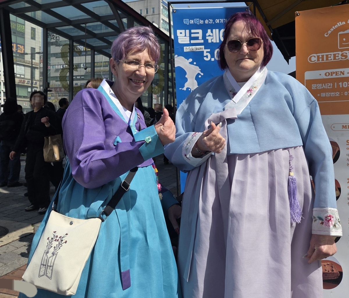 멀리 영국에서 지인 잰과 함께 방탄소년단을 보러 한국을 찾았다는 그는 방탄소년단을 상징하는 보랏빛 한복을 곱게 차려입고 머리도 보라색으로 물들였다.