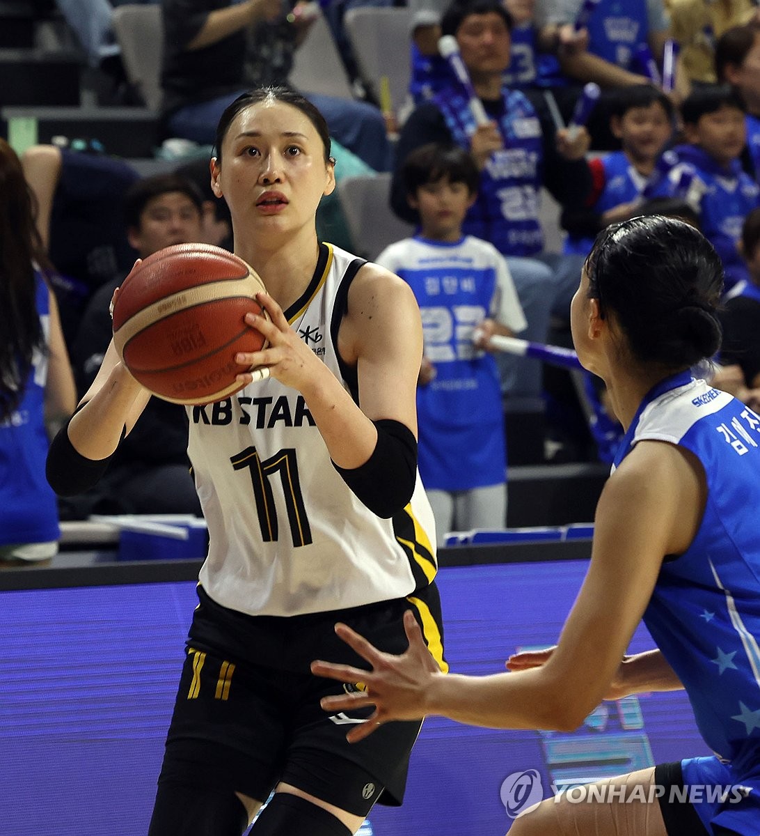 (아산=연합뉴스) 양영석 기자 = 12일 충남 아산 이순신체육관에서 열린 여자 프로농구 플레이오프 3차전 우리은행과 KB스타즈의 경기. KB스타즈 강이슬이 3점 슛을 던지고 있다. 2026.4.12 youngs@yna.co.kr