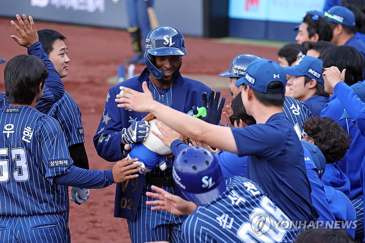 (대구=연합뉴스) 김현태 기자 = 12일 대구 삼성라이온즈파크에서 열린 2026 신한 SOL KBO리그 NC 다이노스와 삼성 라이온즈 경기. 8회 말 1사 상황에서 타석에 선 삼성 디아즈가 솔로홈런을 친 뒤 동료들의 축하를 받고 있다. 2026.4.12 mtkht@yna.co.kr