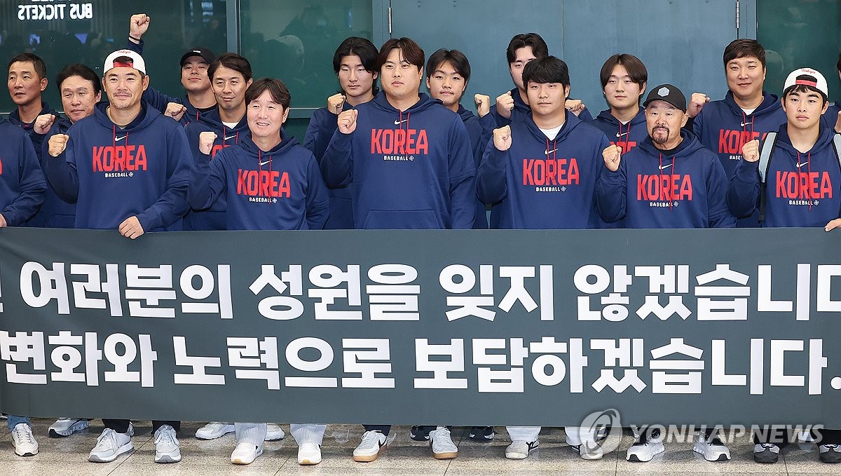 (영종도=연합뉴스) 김성민 기자 = WBC 8강 경기를 마친 한국 야구대표팀 선수들이 16일 인천국제공항 제1터미널을 통해 귀국해 기념 촬영을 하고 있다. 2026.3.16 ksm7976@yna.co.kr