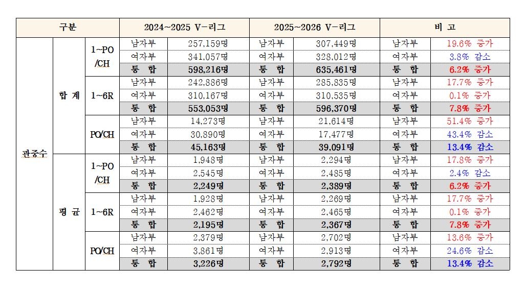 이로써 남녀부 통합 관중 수는 지난 시즌 대비 6.2% 증가했다.