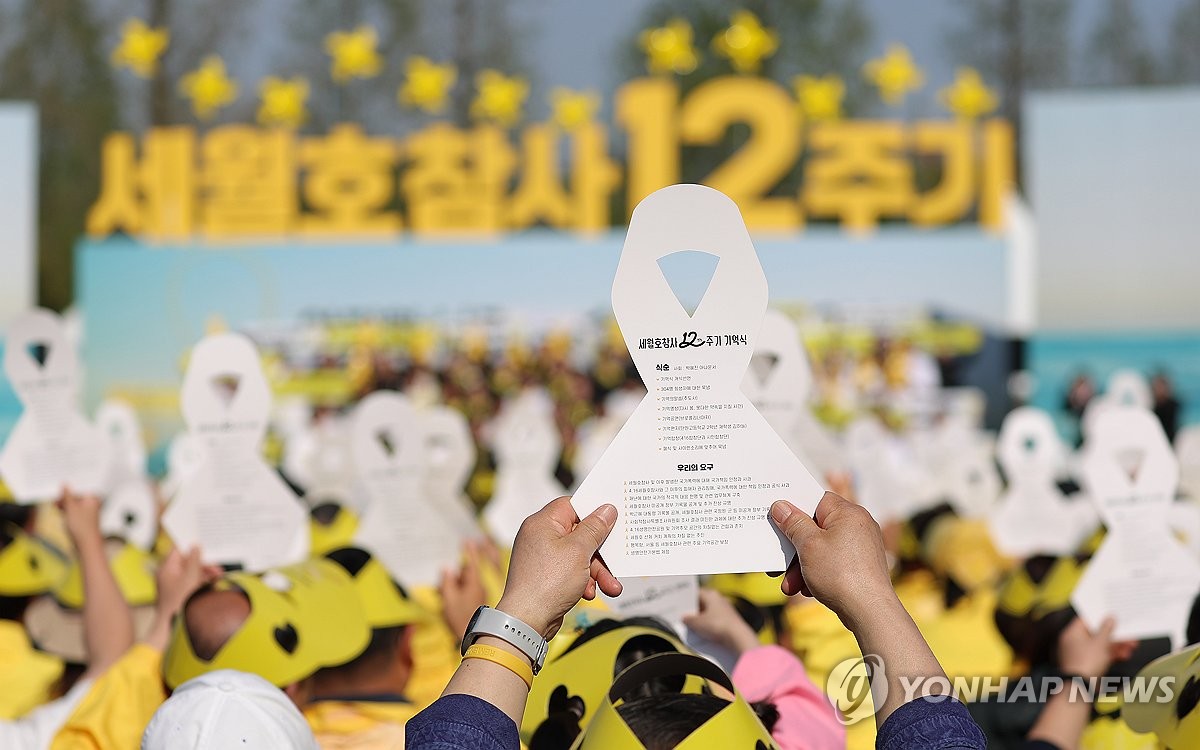 (안산=연합뉴스) 김인유 김솔 기자 = 세월호 참사 12주기를 맞은 16일 오후 경기 안산 화랑유원지에서 희생자들을 추모하고 안전한 사회를 향한 다짐을 되새기는 '세월호 참사 12주기 기억식'이 엄수됐다.