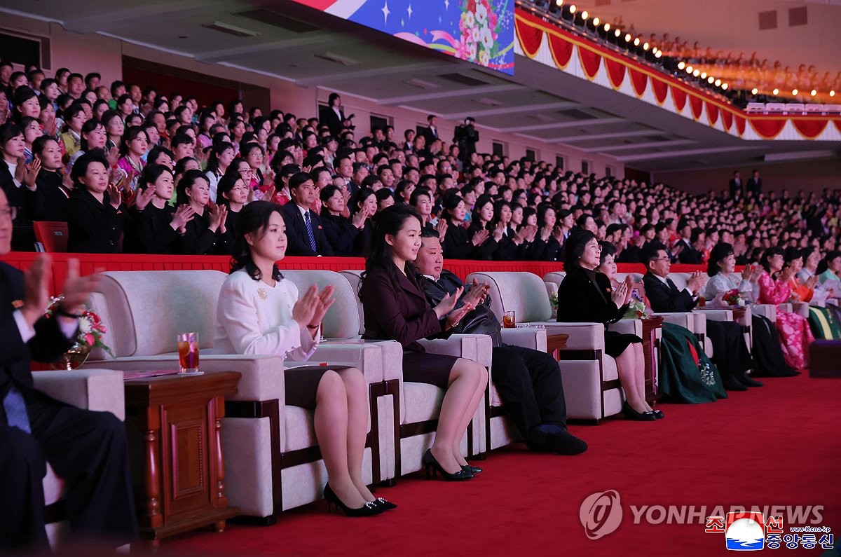 據朝中社3月9日報道,朝鮮國務委員會委員長金正恩8日在平壤體育館與夫人李雪主(左一)和女兒主愛(音譯,左二)一同觀看“三八”國際婦女節文藝匯演。 韓聯社/朝中社(圖片僅限南韓國內使用,嚴禁轉載複製)
