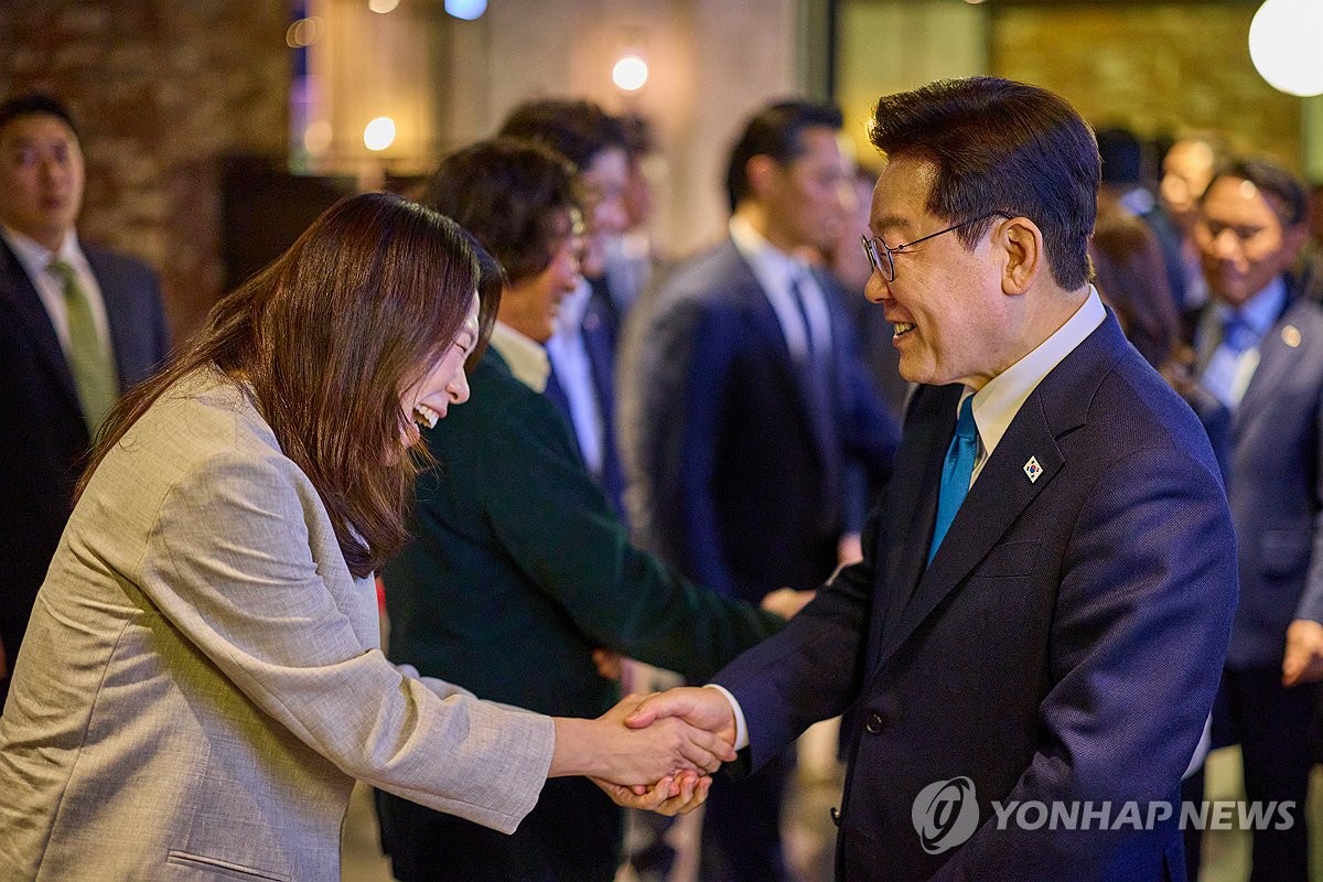 4月15日,在CGV星聚匯龍山愛寶客商場店,南韓總統李在明觀看以濟州四三事件(又稱濟州大屠殺)為題材的韓片《我的名字是》。圖為李在明(右)在觀影前與該片主演廉惠蘭握手致意。 韓聯社
