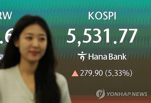 KOSPI«e¤@¤Ñ¦¬½L»ù¤U®À5.96%¡A¦ý·í¤Ñ°ª¶}5.17%¡A¶}½L³ø5523.21ÂI¡CºI¦Ü9®É2¤À¡A«ü¼Æ¤É¦Ü5538.15ÂI¡Aº¦´TÂX¤j¦Ü5.45%¡CºI¦Ü9®É6¤À2¬í³\¡AKOSPI200´Á³f«ü¼Æ¦]ÆJº¦¦Ó¼È°±µ{¦¡¤Æ¥æ©ö5¤ÀÄÁ¡C