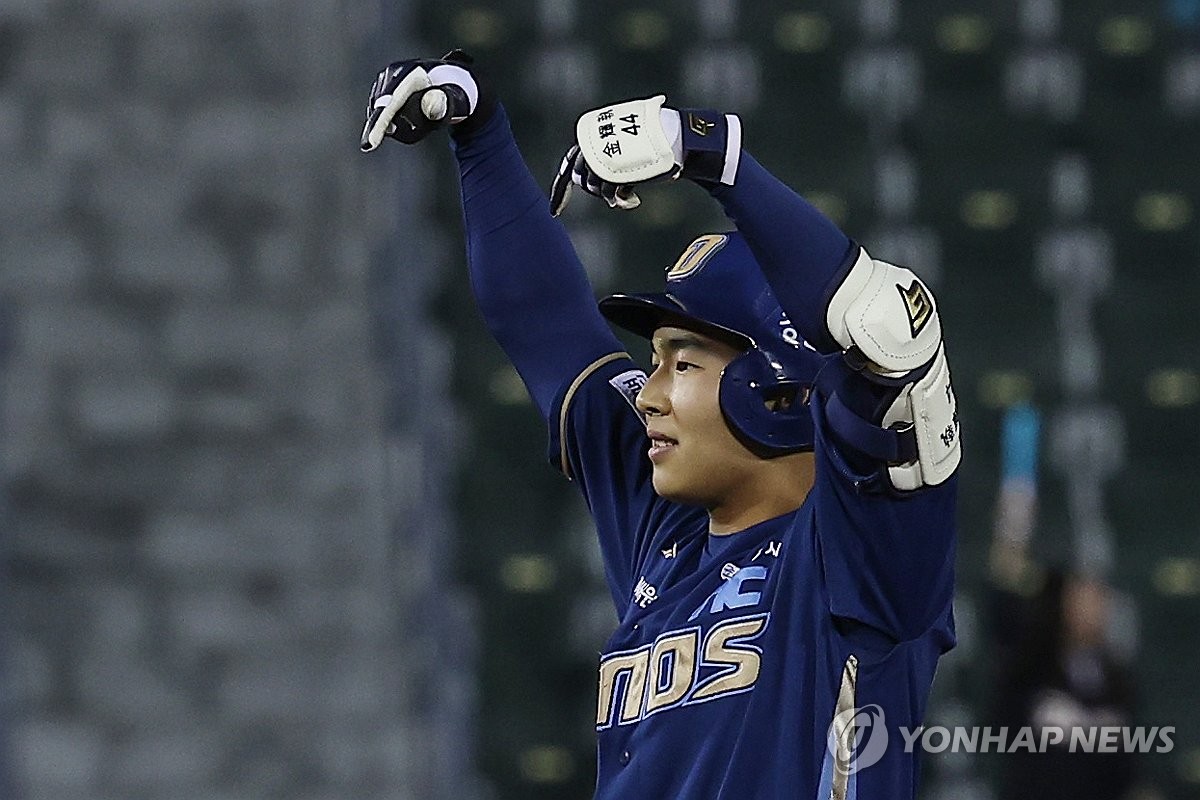 (서울=연합뉴스) 서대연 기자 = 22일 서울 잠실야구장에서 열린 프로야구 2025 신한 SOL 뱅크 KBO리그 NC 다이노스와 LG 트윈스의 경기. 9회초 1사 2루 NC 박민우가 1타점 적시타를 친 뒤 세리머니를 하고 있다. 2025.4.22 dwise@yna.co.kr